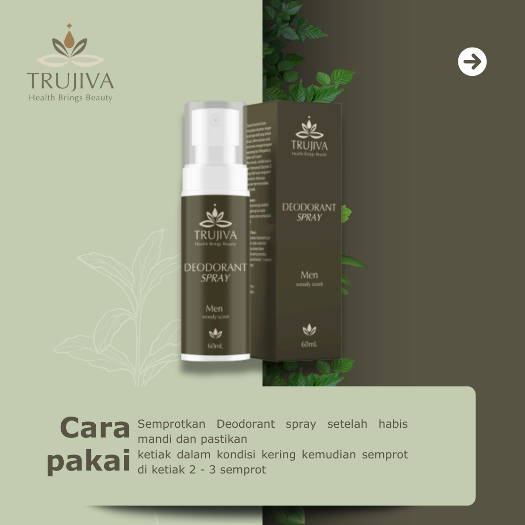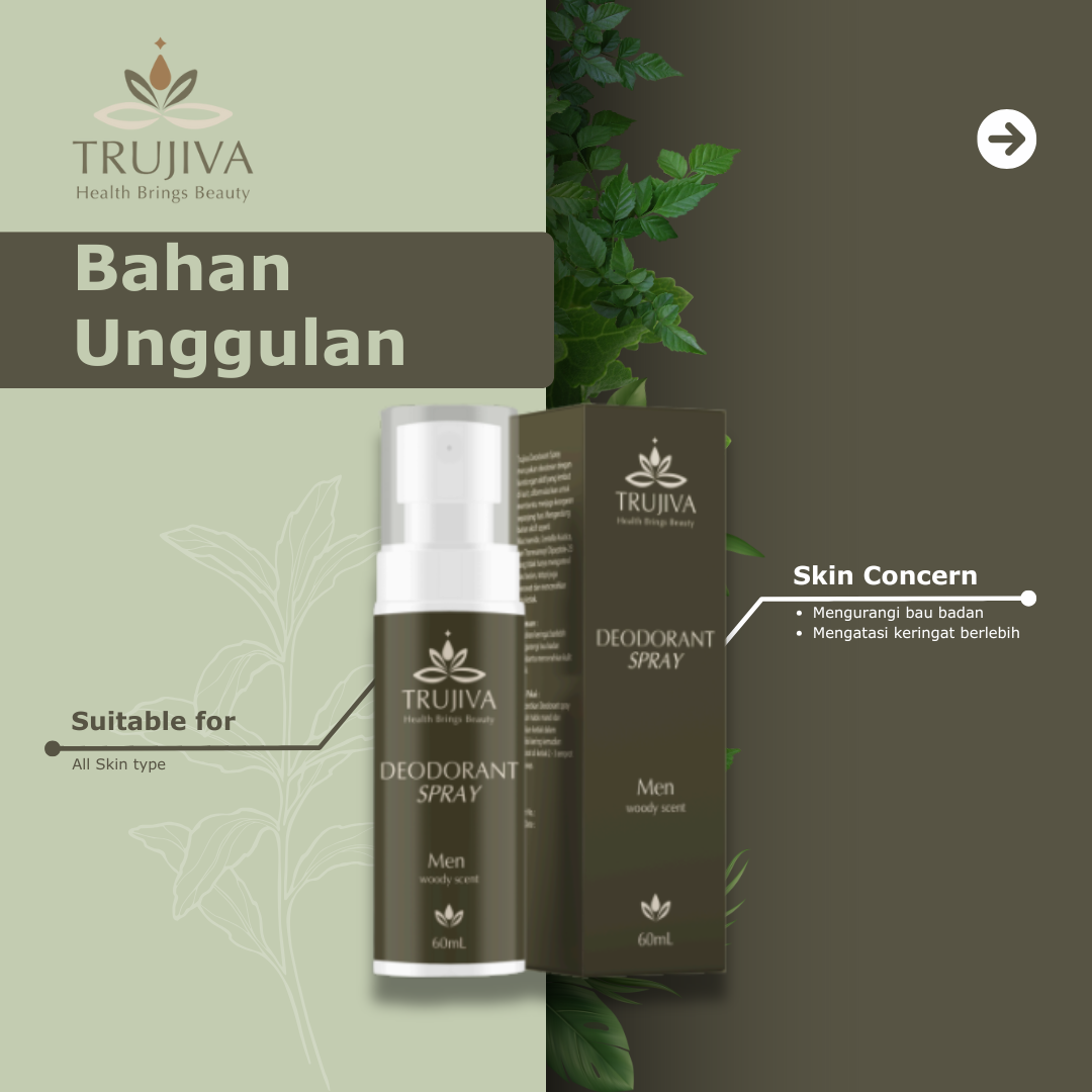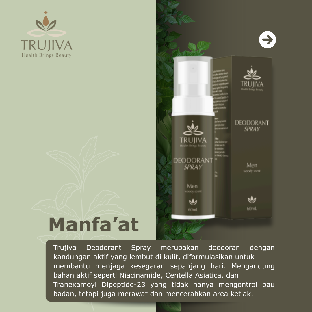 Trujiva Deodorant Spray merupakan deodoran dengan kandungan aktif yang lembut di kulit, diformulasikan untuk membantu menjaga kesegaran sepanjang hari. Mengandung bahan aktif seperti Niacinamide, Centella Asiatica, dan Tranexamoyl Dipeptide-23 yang tidak hanya mengontrol bau badan, tetapi juga merawat dan mencerahkan area ketiak.